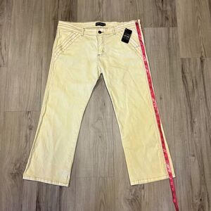 Vintage y2k Spoon capris in light yellow sz 13 low rise. Two front slash pockets with brown embroidered stitching as shown. Two functional back button flap pockets. Semi lightweight denim with stretch. Button zip fly. Bought in the lat 90’s. Never worn. Have been in storage since purchasing. Super rare as Spoon is no more. Measurements in photos.