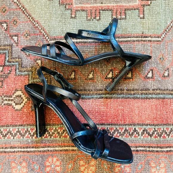 Excellent vintage y2k 2000s Aldo black leather strappy sandals with shiny heel. Euro size 37. Heel is 3 inches. Good vintage condition, leather footbed is peeling a little.