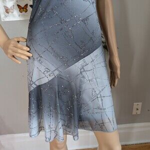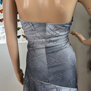 Vintage 2000s (y2k) Taboo halter dress. Gray ombre glitter with silver streaks. Midi length. Asymmetrical hem. Semi-sheer overlay with lining underneath. Dress is in good vintage condition with small run on side of bodice, Please see photos.