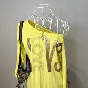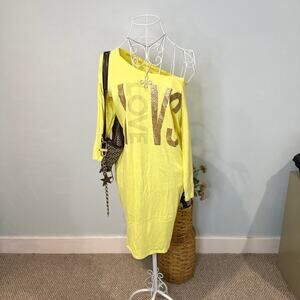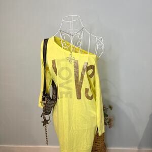 Cute Vintage y2k Victoria’s Secret yellow sparkly ‘I lOVE VS’ off the shoulder long sleeve top/ mini dress🩷