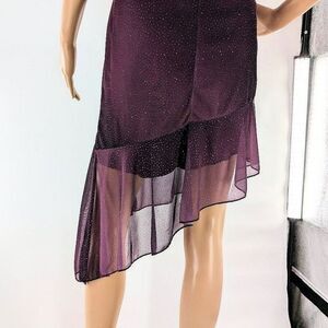 Vintage 2000s (y2k) Wrapper midi dress. Purple ombre with glitter detail. Strapless. Asymmetrical hem. Lined. Sheer mesh overlay. Ruffle hem. Stretchy. Ruching. Dress is in good vintage condition with small rip to seam at ruffle hem. Please see photo.
