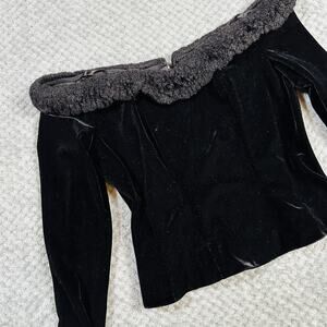 Vintage y2k black velvet velour off shoulder faux fur crop long sleeve blouse holiday gorgeous alex evenings