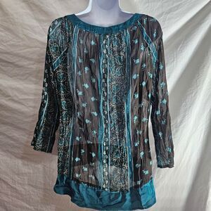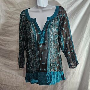 Vintage y2k boho blue brown indie 3/4 sleeve blouse