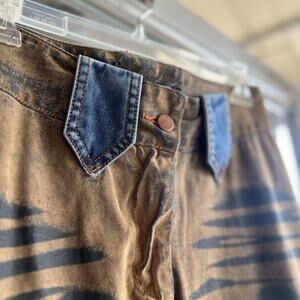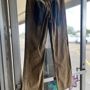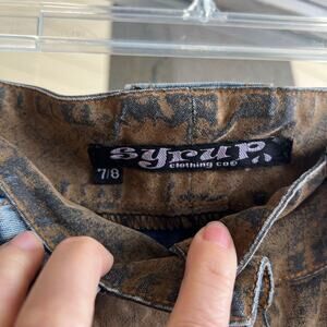 Vintage Y2K brown distressed suede jeans from Syrup Clothing Co. with large denim belt loops. There is some wearing, but no major stains, holes, or tears. The tag says size 7/8.