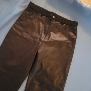 cute vintage y2k brown leather pants by mitchies matchings. pants are slightly stretchy and in good condition. size medium, waist measures 15" roughly while Laid flat 🌸