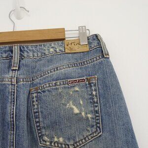 Vintage y2k low rise denim maxi skirt with fading. Very adorable. Has distressing on the front and back. From the brand hint jeans. Size 1 juniors.