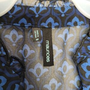 Maurices top: black blue, geometric pattern, button front, tie waist