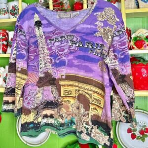 Vintage y2k Lifestyle colorful vibrant purple sequenced Paris eiffel tower graphic cyber print longsleeve blouse! 100% cotton. Measurements in the pics!