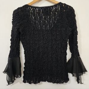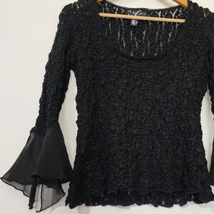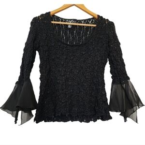 A stylish black blouse with a scoop neck and ruched texture, featuring dramatic bell sleeves.