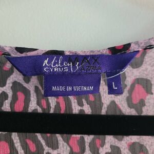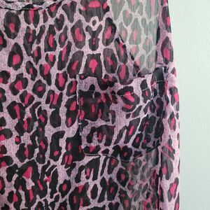 Vintage y2k miley cyrus pink leopard print sheer racerback tank with a front pocket and an asymmetrical hem. In excellent pre owned condition with no signs of wear or damage.