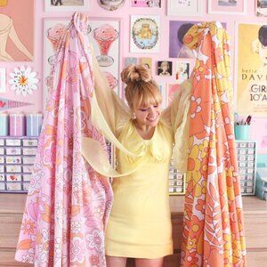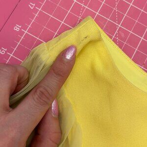Feels like polyester but there is no content tag. Good condition. There are a few marks, the hem is slightly uneven (but I think it could probably be fixed with ironing or just re-sewing the hem) and the invisible hem stitches are slightly visible from the outside. See the last photos for details.
