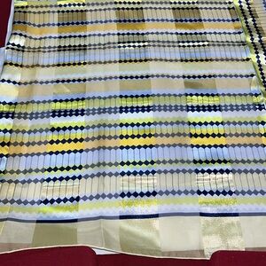 Vintage yellow white silky Big square scarf zig zag 70s print Mod, retro 39x39”