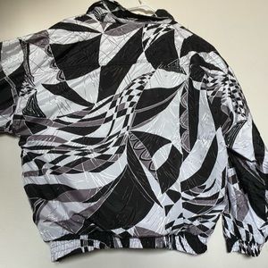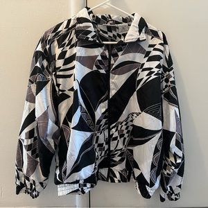 Letting go of this vintage party jacket. 100% polyester goodness, has a thin soft lining. The silver the print has a sparkle to it.