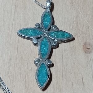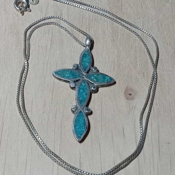 normal vintage wear. cross stamped sterling on back and 18" long necklace stamped near clasp.
