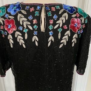 80’s glam! 360 degrees of hand beading & sequins. Excellent gently used vintage condition. No major flaws. Some discoloring to inner tag. 100% pure Silk. Lined. Padded shoulders. Tag size cut out. Fits like a modern day L / XL. ONLY 1 outfit available, but listing as both. Plz refer to listed measurements to be sure! Laying flat, unstretched, measuring across: top- p2p: 20”. Skirt: W: 18-22” (elastic band) L: 24.5”