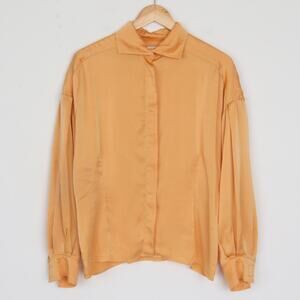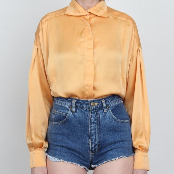 Vintage blouse in the softest buttery silk. unique features including drop shoulder with full gathered sleeves, double button collar, and hidden button placket. perfect creamsicle pastel orange hue.