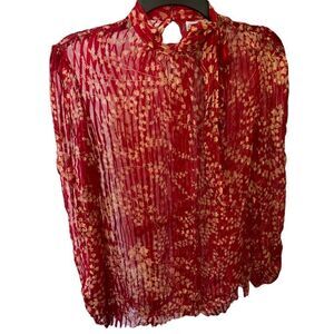 Gorgeous Red and Gold 100% Silk blouse, size Large or 14. This blouse features a high neck line, key hole back with two tiny buttons (shown in last photo), front tie, and raw hem. A timeless piece! No manufacturer tag. This blouse is somewhat sheer so you may want to wear a cami underneath.