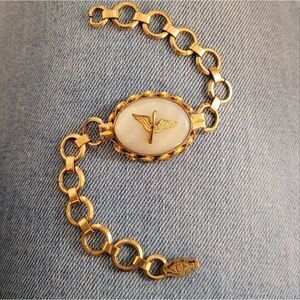 Here we have a USAAF sweetheart photo lockett bracelet. Aviation branch insignia on mother of pearl. The back is hinged and opens to a photo compartment.