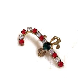 Darling little red and white rhinestone candy cane Brooche with a Goldtone ribbon around it and a green rhinestone in the center
