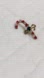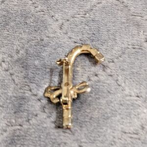 Darling little red and white rhinestone candy cane Brooche with a Goldtone ribbon around it and a green rhinestone in the center
