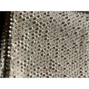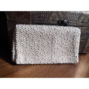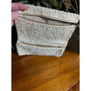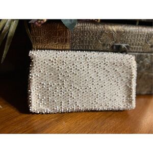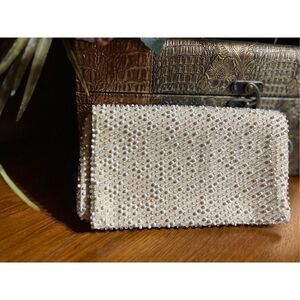Still in fantastic condition. Measures 9" wide by 5" tall. Features a fold over flap with a zippered pocket on top and the main compartment is zippered with a silk lining. All beads still appear to be intact and zippers are both still functional.