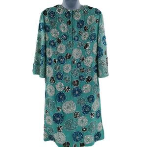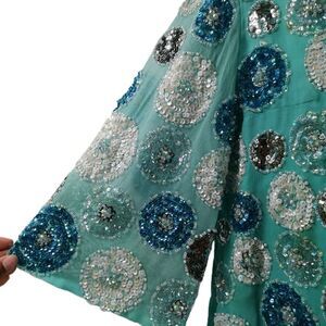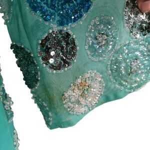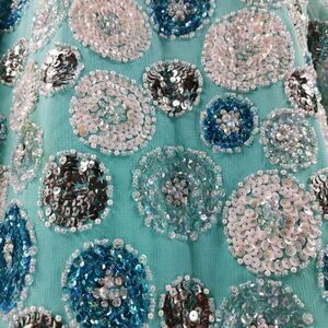 This stunning 1960s vintage dress is a true mid-century masterpiece, featuring a dazzling aqua blue base adorned with intricate silver, blue, and black sequin beadwork. The circular sequin patterns create a celestial-inspired shimmer, catching the light beautifully.