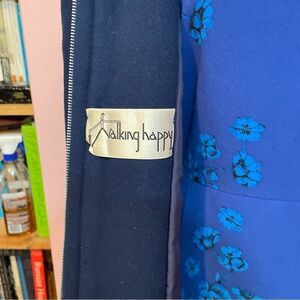 Silver tone zippered pockets and front closure with diamond-shaped geometric zipper pulls. Epaulettes, a belt in rear to accentuate waist, and fold over straps at cuffs with decorative blue and white buttons. Fold over collar.