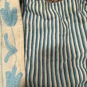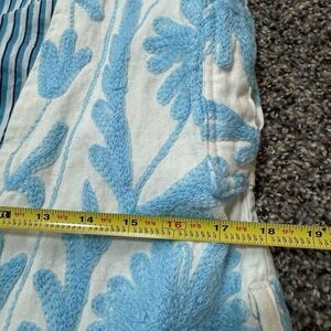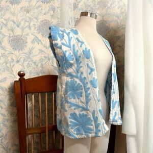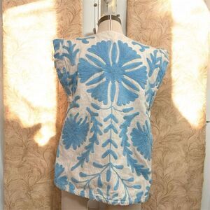 Vintage 1970s white and blue carpet embroidered paisley floral tuxedo vest. Sleeveless, open front. Stripe lining.