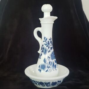 Vintage 1972 Avon Delft Blue Milk Glass Cruet With Bowl - Floral Design
