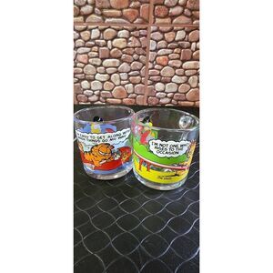 Each glass features the beloved lazy orange cat in classic designs that capture the humor and wit of Jim Davis' iconic comic strip. These collectible mugs were part of a promotional series, making them a must-have for Garfield fans and vintage enthusiasts alike.
