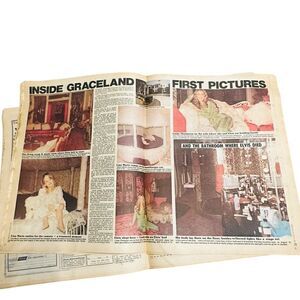 Vintage 1978 Elvis Memorial. Full copy of The Star magazine August 15th 1978 - 1 year after Elvis Presley died with 12 page pull out feature . Some great pictures of The King, cool memorabilia. Magazine (on newsprint) is complete but shows a little aging in color and around edges but no tears or holes .