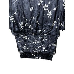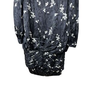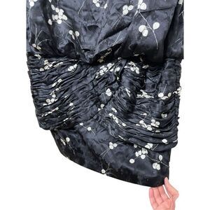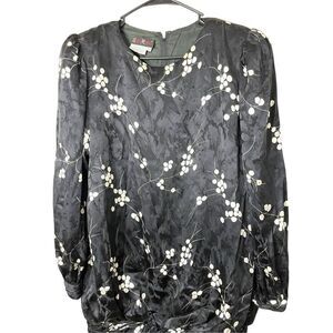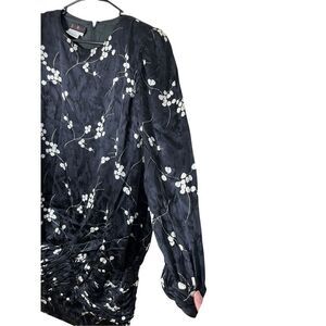 Vintage 1980's Saint Romei Sz 12 100% Silk Dress Black Floral Print. Very good condition there is a small stain on the arm shown in pic. Long sleeve. Ruching on the bottom. Beautiful evening dress.