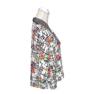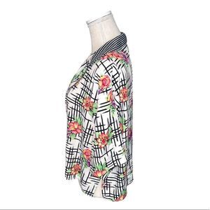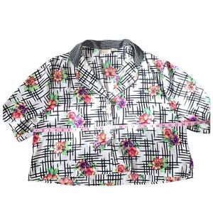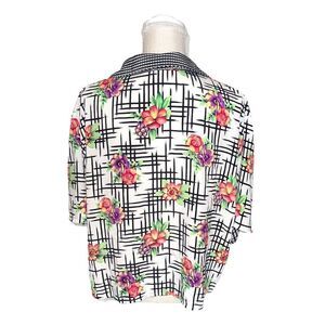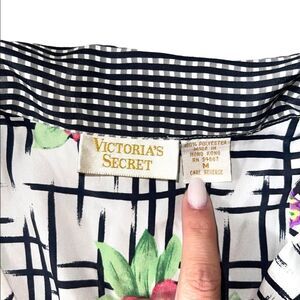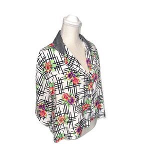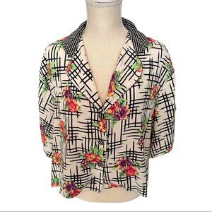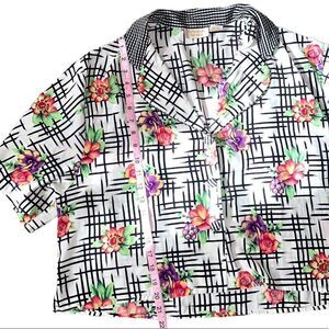 Vintage 1980’s Victoria's Secret Gold Label Floral & Abstract Button Down Shirt. Features Gingham check button and collar accents. Oversized, cropped/boxy fit. Machine wash. 100% polyester.