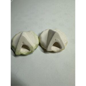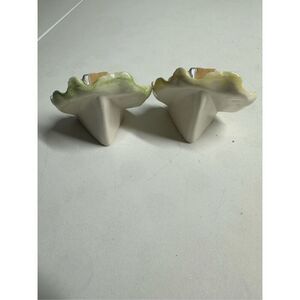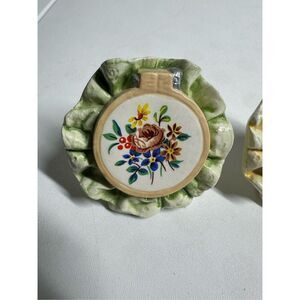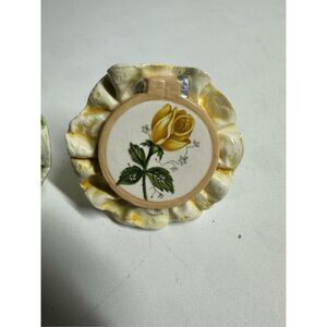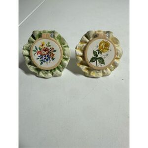 These are two vintage decorative ceramic stands with a floral design. Each stand features a round central section adorned with a hand-painted flower motif—one with a colorful bouquet and the other with a yellow rose. The edges have a ruffled, textured design, one with green accents and the other with yellow. The back of each piece has a triangular base for stability. These stands appear to be handcrafted and have a delicate, classic aesthetic, possibly mid-century in style. They can serve as decorative accents or small display pieces.