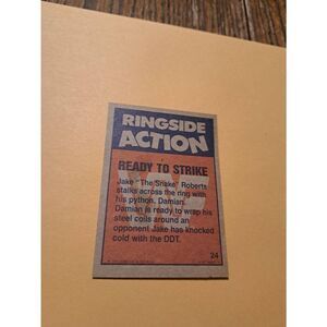 Vintage 1987 WWF Ringside Action trading card featuring Jake “The Snake” Roberts and his python Damien. Captioned “Ready to Strike,” this card shows Jake standing in the ring holding his snake, moments before a fierce match. Printed in the USA by Topps Chewing Gum Inc. and Titan Sports Inc. Card number 24. Card is ungraded and sold as shown — please note, I am not a professional trading card grader. You will receive the exact card pictured. Good vintage condition with typical age-related surface wear.