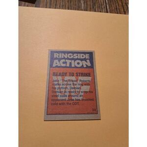 Vintage 1987 WWF Ringside Action trading card featuring Jake “The Snake” Roberts and his python Damien. Captioned “Ready to Strike,” this card shows Jake standing in the ring holding his snake, moments before a fierce match. Printed in the USA by Topps Chewing Gum Inc. and Titan Sports Inc. Card number 24. Card is ungraded and sold as shown — please note, I am not a professional trading card grader. You will receive the exact card pictured. Good vintage condition with typical age-related surface wear.