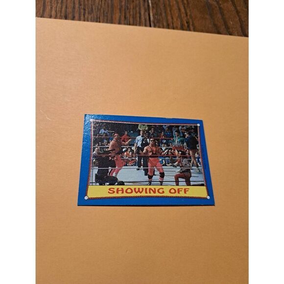 Vintage 1987 Topps WWF WrestleMania III trading card, number 63, titled “Showing Off.” The Hart Foundation is pictured strutting into the ring with confidence, capturing their classic entrance style. Bold caption in red and yellow reads “Showing Off.” Produced by Topps Chewing Gum Inc., 1987, under license from Titan Sports Inc. This is a circulated, ungraded vintage card, not professionally graded. Please review all photos carefully as the card shown is the exact one you will receive.