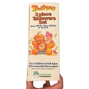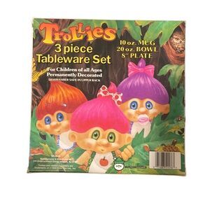 Vintage 1992 Peter Pan Trollies 3 Piece Tableware Set. Includes a 10oz mug, a 20oz bowl, and 8” plate. Excellent condition, never used or open.