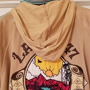 Purchased circa 2005 and lightly worn. This item has been dry cleaned before listing. Zipper pockets, zip up front. Hood that can be zipped into collar. Embroidery on front and back. Really a beautiful piece of street wear.