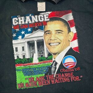 Vintage 2008 Obama Campaign “Change We Can Believe In” Culture Tee. Nike Tag. Rap Tee Style. “We Are The Change We Have Been Waiting For.” Sick Culture Tee. Crazy to see this on a Nike tag. Big Boy Tee. Could be a sleep tee. Extra Long. Great Condition 8/10. Nice Fade. Tagged XXL. See measurements.