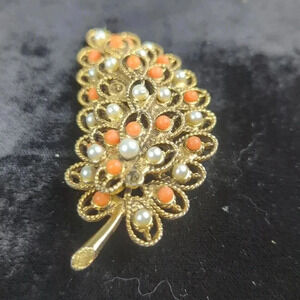 Vintage gold tone leaf brooch, 3 layers of teardrop shaped fronds, each with a faux pearl in it, alternating white and orange.