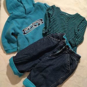 Moved to new 2nd closet @skyrubinetc! Vintage 4 piece Baby Gap Jeans outfit including jeans, long sleeve shirt, pullover hooded fleece, and cap. In very good preowned condition; small discoloration on inside of sleeve (see photo). Size Medium (6-12 months).