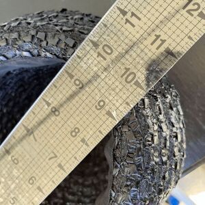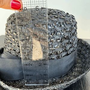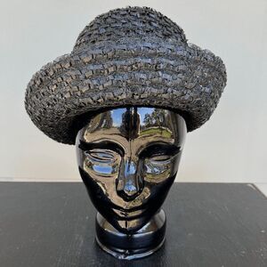 A sleek, noir spin on the classic cloche. Hand-woven black straw ribbon is shaped into a six-inch crown, then finished with a wide grosgrain band and flat bow. The airy lattice weave up top feels light on the head, while the tighter basket weave at the brim lets you flip it up for a jaunty 1950s profile or nudge it down for quiet film-noir drama. This hat comes from the estate of a Michigan socialite named Nancy.
