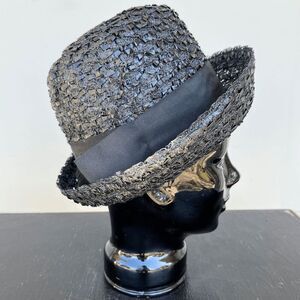mid-century cloche, noir straw hat, upturned brim, grosgrain bow accent, cottage-core chic, 1950s cocktail hat, vintage summer topper, classic black straw, flapper costume.