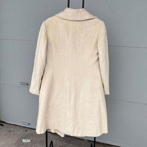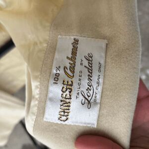 This stunning vintage Lorendale coat is a rare union-made in USA piece crafted from 100% Chinese cashmere in a soft ivory hue. It's so soft to the touch, and I feel glamorous whenever I wear it. This mid-century gem features a soft, refined silhouette, tie interior closure and oversized notched lapels. The fully lined interior ensures comfort and warmth, while the single-breasted design exudes sophistication. The back paneling adds a flattering, structured touch. Sleeves end a bit higher on the wrist than a modern coat to show off gloves. Perfectly tailored for a flattering silhouette, this coat is ideal for layering during fall and winter. A must-have for lovers of vintage style and sustainable fashion. Sourced at a glamorous LA estate sale. Getting a similar coat today would cost you well over $1,000.