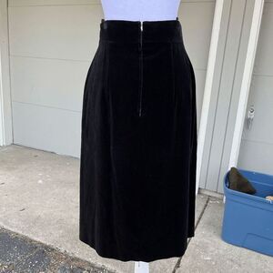 Step into timeless elegance with this stunning 1950s–1960s vintage black velvet skirt. Made from thick, luscious, 100% cotton velvet, this high-waisted A-line silhouette drapes beautifully for a classic, sophisticated look. The decorative velvet tie at the waist is accented with rhinestone grommets, adding a touch of vintage glamour. This piece showcases quality mid-century European craftsmanship with a metal zipper at the back. The size is marked 38, and the structured waistband ensures a flattering fit. A versatile staple that pairs effortlessly with silk blouses or fitted knits for an effortlessly chic vintage ensemble.