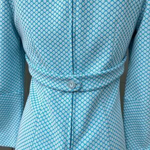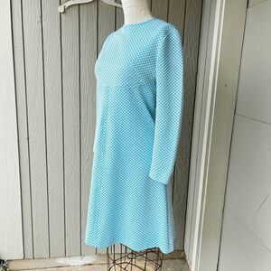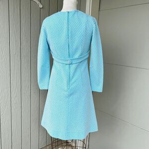 This vintage 1960s mod mini dress features a textured turquoise and white geometric diamond pattern in a stretch knit fabric, offering a structured yet comfortable silhouette. The clean a line, for and flare silouette, long sleeves, and high neckline are classic of the era, while the gently flared skirt and belted back add shape and charm. It zips up the back with a matching blue metal zipper with plastic teeth and is unlined. The fabric has some stretch and is likely a synthetic blend typical to the mid-century era. Perfect for spring styling or a retro-themed event, this dress is a statement piece that brings instant vintage authenticity. Flattering empire waist.