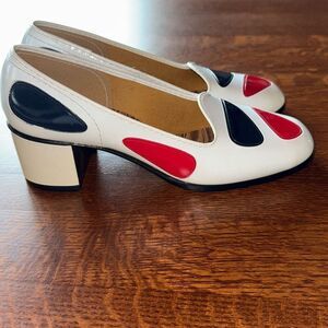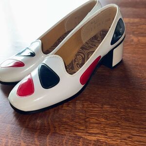 White patent faux leather with teardrop patchwork design. Well made with psychedelic footbed pattern. Square toe, block platform heel. Women’s size 7B