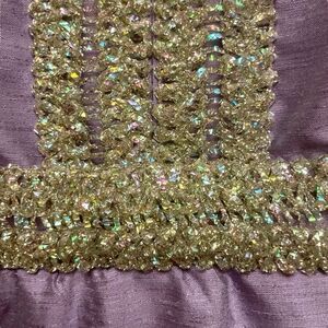 This vintage dress is in excellent condition. The fabric may be silk shantung, but I’m not sure. There is no size tag or fabric tag in the dress. It is likely handmade given the one tag that is sewn in. There is interesting iridescent trim on the bodice. It feels like plastic, and I have no idea if it’s sewn on, glued on, or both. The dress is completely lined as well. I don’t know what size it is exactly, but given the measurements, my guess is small.