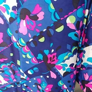 This dress will make you wanna go-go-go! It starts w/a sleeveless satiny polyester dress with vibrant color block floral pattern. Zips up back, fully lined. Add matching jacket w/fabric buttons that snap closed, also fully lined, same length as dress (maybe 1" longer). Dress measurements laid flat: 17" pit to pit, 16" waist, 36" shoulder to hem. Very good vintage condition. Minor pulls in thread in a few places, not obvious w/this pattern, tried to show in last 2 photos. No tags. Amazing combo!